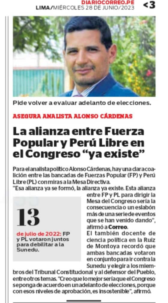 Alonso Cárdenas, docente de la carrera de Ciencia Política de la Universidad Antonio Ruiz de Montoya (UARM), participó en un informe del diario Correo acerca de la alianza entre los partidos Fuerza Popular y Perú Libre en el Congreso. Sostiene que esa coalición es clara con miras a la elección de la Mesa Directiva del Congreso. Para el politólogo, esta alianza es la consecuencia de una serie de eventos anteriores. Recordó que ambas bancadas votaron en conjunto para ir contra la Sunedu y en la elección de los miembros del Tribunal Constitucional y el defensor del pueblo. “Creo que lo mejor sería que el Congreso se ponga de acuerdo en un adelanto de elecciones porque con esos niveles de desaprobación es insostenible”, afirmó.