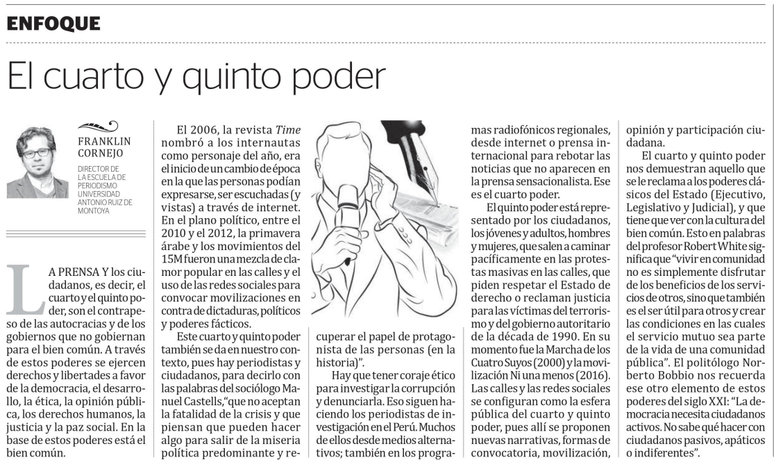 La prensa y los ciudadanos, es decir, el cuarto y el quinto poder, son el contrapeso de las autocracias y de los gobiernos que no gobiernan para el bien común. A través de estos poderes se ejerce derechos y libertades a favor de la democracia, el desarrollo, la ética, la opinión pública, los derechos humanos, la justicia y la paz social. En la base de estos poderes está el bien común. El 2006, la revista Time nombró a los internautas como personaje del año, era el inicio de un cambio de época en la que las personas podían expresarse, ser escuchadas (y vistas) a través de internet. En el plano político, entre el 2010 y el 2012, la primavera árabe y los movimientos del 15M fueron una mezcla de clamor popular en las calles y el uso de las redes sociales para convocar movilizaciones en contra de las dictaduras, los políticos y los poderes fácticos.
