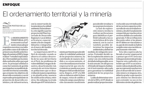 Esta idea equivocada ha llevado al sector empresarial a pensar que el OT sería una traba para la inversión privada. Superar esta confusión y entender que el OT es un instrumento valioso de planificación, que no representa una barrera para el desarrollo de la inversión minera ni ninguna otra, debería ayudar a que nuestro país elimine los obstáculos para extender su uso en los diferentes niveles de gobierno.