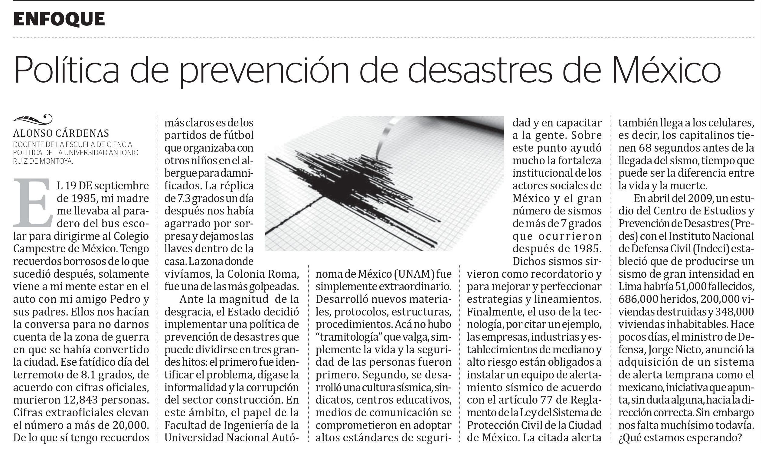 Ante la magnitud de la desgracia, el Estado decidió implementar una política de prevención de desastres que puede dividirse en tres grandes hitos: El primero fue identificar el problema, dígase la informalidad y la corrupción del sector construcción. En este ámbito, el papel de la Facultad de Ingeniería de la Universidad Nacional Autónoma de México (UNAM) fue simplemente extraordinario. Desarrolló nuevos materiales, protocolos, estructuras, procedimientos. Acá no hubo “tramitología” que valga, simplemente la vida y la seguridad de las personas fueron primero. Segundo, se desarrolló una cultura sísmica, sindicatos, centros educativos, medios de comunicación se comprometieron en adoptar altos estándares de seguridad y en capacitar a la gente. Sobre este punto ayudó mucho la fortaleza institucional de los actores sociales de México y el gran número de sismos de más de 7 grados que ocurrieron después de 1985. Dichos sismos sirvieron como recordatorio y para mejorar y perfeccionar estrategias y lineamientos. Finalmente el uso de la tecnología, por citar un ejemplo, las empresas, industrias y establecimientos de mediano y alto riesgo están obligados a instalar un equipo de alertamiento sísmico de acuerdo al Artículo 77 de Reglamento de la Ley del Sistema de Protección Civil de la Ciudad de México. La citada alerta también llega a los celulares, es decir los capitalinos tienen 68 segundos antes de la llegada del sismo, tiempo que puede ser la diferencia entre la vida y la muerte.