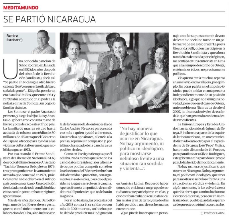 “No hay manera de justificar lo que ocurre en Nicaragua. No hay argumento, ni político ni ideológico, para mostrarse nebuloso frente a una situación tan sórdida y violenta…”.