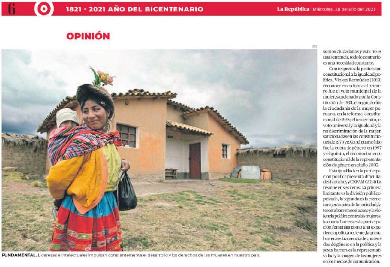 Existe una complejidad para entender los procesos históricos del país. Tal es el caso de la participación política de la mujer, que desde los albores del periodo republicano se hizo manifiesto tanto en el campo de batalla pasando por su lucha por el sufragio y la actual reivindicación. El proceso de construcción de ciudadanía no es un elemento aislado en nuestra actualidad, todo lo contrario, la ética nos enseña que es una convicción vital, una práctica cotidiana que incluye no solamente a la mujer sino a todos (sin excluir a nadie, entiéndase bien esto).