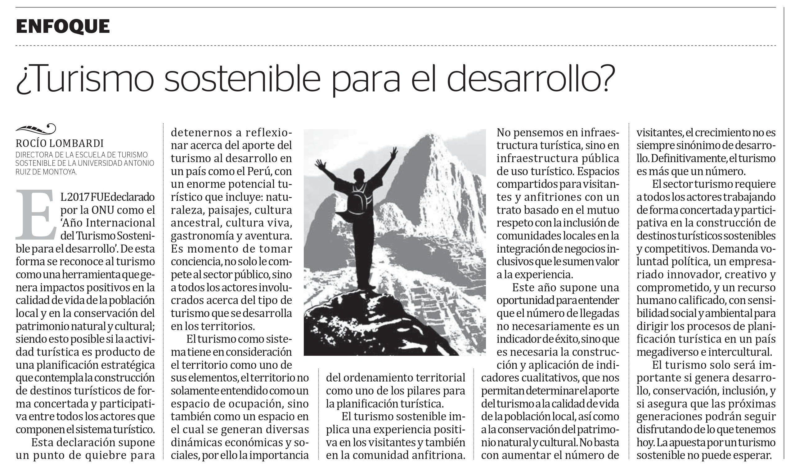 El 2017 fue declarado por la ONU como el “Año Internacional del Turismo Sostenible para el desarrollo”. De esta forma se reconoce al turismo como una herramienta que genera impactos positivos en la calidad de vida de la población local y en la conservación del patrimonio natural y cultural; siendo esto posible si la actividad turística es producto de una planificación estratégica que contempla la construcción de destinos turísticos de forma concertada y participativa entre todos los actores que componen el sistema turístico.