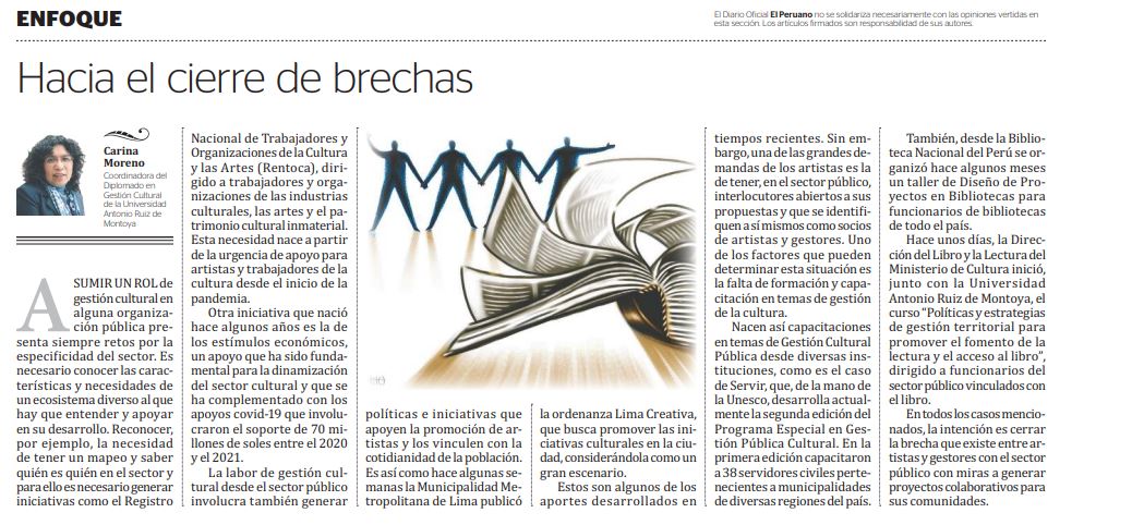 Asumir un rol de gestión cultural en alguna organización pública presenta siempre retos por la especificidad del sector. Es necesario conocer las características y necesidades de un ecosistema diverso al que hay que entender y apoyar en su desarrollo. Reconocer, por ejemplo, la necesidad de tener un mapeo y saber quién es quién en el sector y para ello es necesario generar iniciativas como el Registro Nacional de Trabajadores y Organizaciones de la Cultura y las Artes (Rentoca), dirigido a trabajadores y organizaciones de las industrias culturales, las artes y el patrimonio cultural inmaterial. Esta necesidad nace a partir de la urgencia de apoyo para artistas y trabajadores de la cultura desde el inicio de la pandemia.