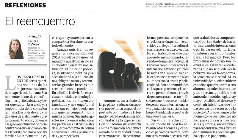 Sin duda, la educación superior debe brindar las herramientas técnicas y especiales para cada carrera, pero nuestro mundo necesita más que trabajadores competentes. Oportunidades de realizar un intercambio internacional o participar en voluntariados también son importantes para la formación. Pero los problemas de hoy, no son problemas individuales. Están tan entrelazados que no se puede ver la pobreza sin ver la economía, la educación o la salud.  Si las universidades pueden cultivar espacios que preparen a sus alumnos a poder interactuar y unir personas de diferentes antecedentes e ideologías hay mayor posibilidad de crear y construir iniciativas que impacten varios sectores de la sociedad. Aprovechemos este momento de reencuentro no solo para abrazar a nuestros seres queridos sino también para encontrar nuevas formas de disminuir las brechas que ha dejado la pandemia.