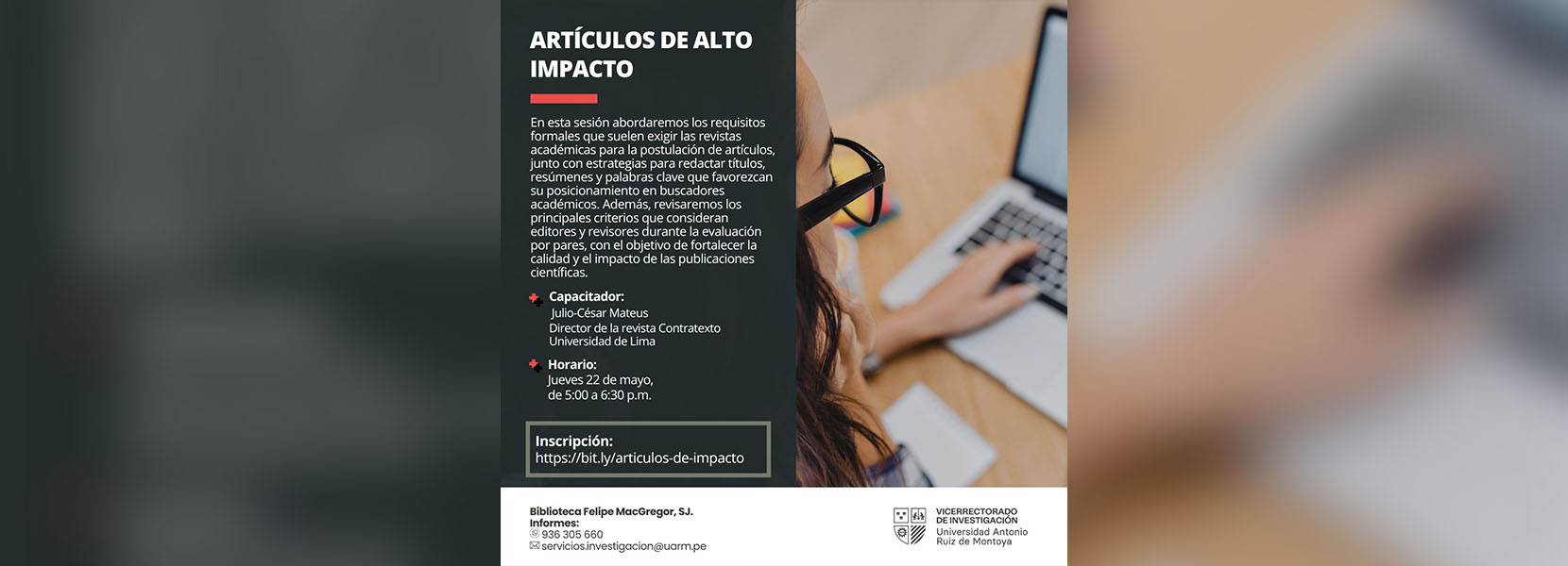 En el marco del Plan de Capacitaciones 2025, que busca fortalecer las competencias investigativas de los miembros de la UARM, el Vicerrectorado de Investigación a través de la Biblioteca Felipe MacGregor SJ organiza la segunda capacitación virtual: “Artículos de alto impacto”, a realizarse el jueves 22 de mayo, a las 5:00 p. m.