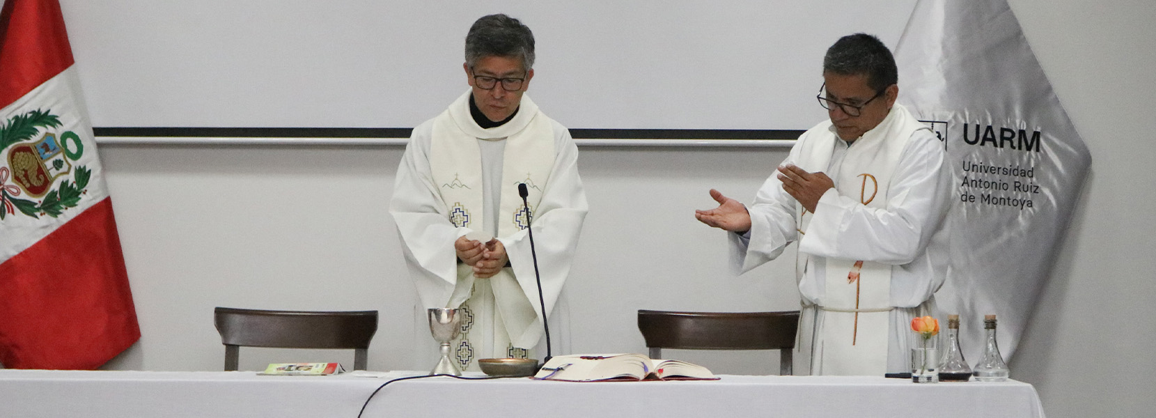 Daniel Chaw SJ, coordinador de Pastoral UARM, comentó que en esta eucaristía se quiso traer a la memoria, con actitud agradecida, el tiempo recorrido: por todos los momentos gratos y por aquellos desafiantes que hoy definen a la institución educativa. Se oró por la paz, la justicia y el respeto de la dignidad de las personas para que sea siempre un principio ineludible y fundamental. Así también se agradeció a los trabajadores homenajeados por su entrega y servicio generoso en la misión que se les ha encomendado. El P. Rafael Fernández Hart SJ, rector de la UARM y el P. Marvin Quispe SJ, jefe de la Oficina de Formación Ignaciana de la UARM, presidieron la celebración eucarística, cuya lectura del evangelio invita a salir de uno mismo y a abrazar al otro.