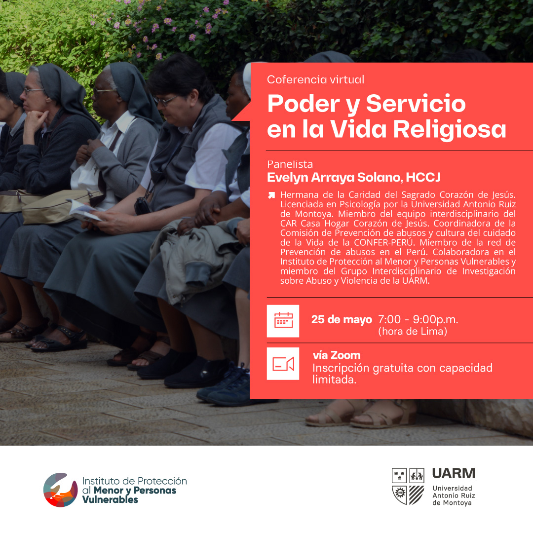 El Instituto de Protección al Menor y Personas Vulnerables (IPMEP) de la Universidad Antonio Ruiz de Montoya (UARM) invita a participar de la Conferencia virtual “Poder y Servicio en la Vida Religiosa”, la cual forma parte de su Ciclo de Conferencias Virtuales 2023. Se llevará a cabo el jueves 25 de mayo a las 7 de la noche y estará a cargo de la ponente Evelyn Arraya Solano, HCCJ, hermana de la Caridad del Sagrado Corazón de Jesús.