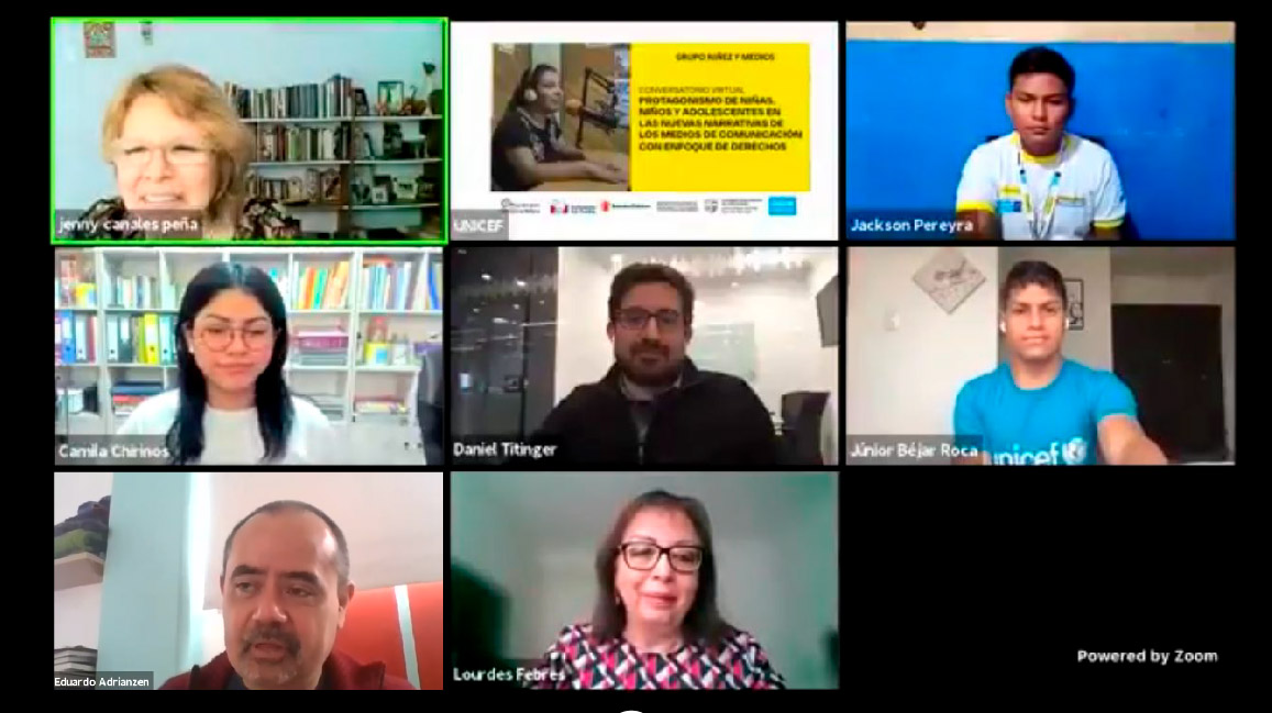 Previo a la conmemoración del aniversario de la Convención sobre los Derechos del Niño, este 11 de noviembre se llevó a cabo el conversatorio virtual “Protagonismo de niñas, niños y adolescentes en las nuevas narrativas de los medios de comunicación con enfoque de derechos”, organizado por el Grupo Niñez y Medios integrado por Acción por los Niños, Defensoría del Pueblo, Save the Children, la Sociedad Nacional de Radio y Televisión, UNICEF y la carrera Profesional de Periodismo de la Universidad Antonio Ruiz de Montoya (UARM).