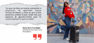 “La primera cualidad que debe tener un joven líder es la comunicación asertiva. También pensamiento estratégico y habilidades para el trabajo en equipo como la escucha activa para lograr soluciones y tener un manejo de guía de todo el grupo”, sostiene Diana de la Cruz Rojas, estudiante de octavo ciclo de Periodismo.