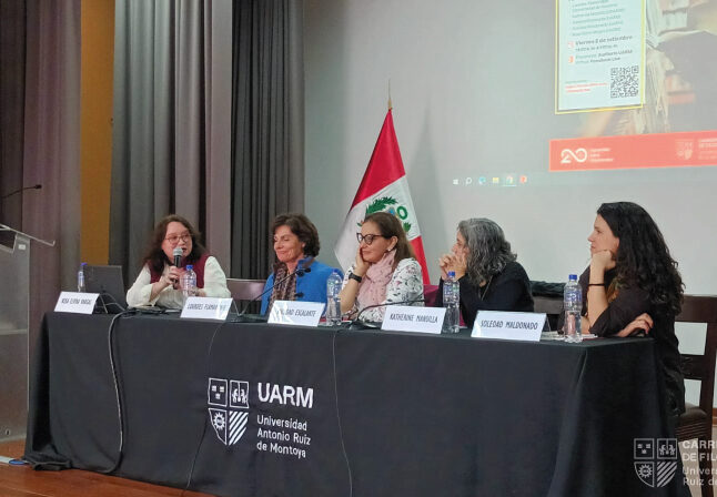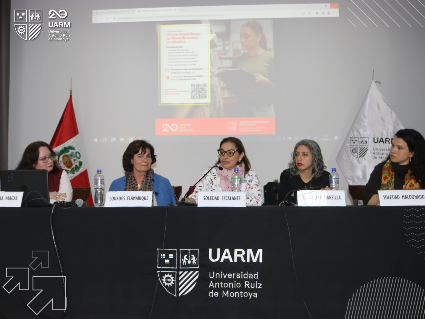 El 8 de setiembre, Lourdes Flamarique compartió su experiencia personal como mujer filósofa, desde su formación hasta la actualidad, en el Conversatorio: Voces femeninas: la filosofía como profesión, evento en el que estuvo acompañada de Katherine Mansilla (UNMSM), Soledad Escalante, directora ejecutiva de la Revista Sílex, Soledad Maldonado, directora de Responsabilidad Social Universitaria de la UARM y de Rosa Elvira Vargas, jefa de la carrera de Filosofía. Las panelistas dialogaron sobre el rol de la mujer en el ámbito profesional de la filosofía y la importancia de esta disciplina en la formación profesional de los estudiantes.