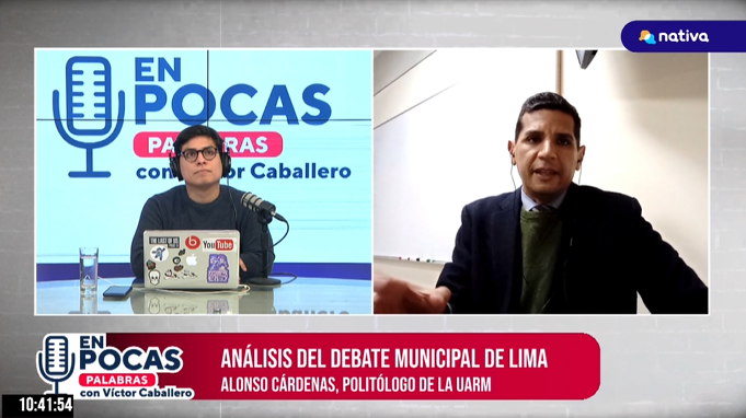 Alonso Cárdenas, docente de la carrera de Ciencia Política de la Universidad Antonio Ruiz de Montoya (UARM), en una entrevista en el programa En Pocas Palabras de Nativa TV, analizó el último debate electoral para las Elecciones Regionales y Municipales 2022. "Cada vez de hace más complejo votar por el mal menor porque es muy difícil identificarlos mientras tengamos este modelo de democracia con partidos muy precarios", precisó.