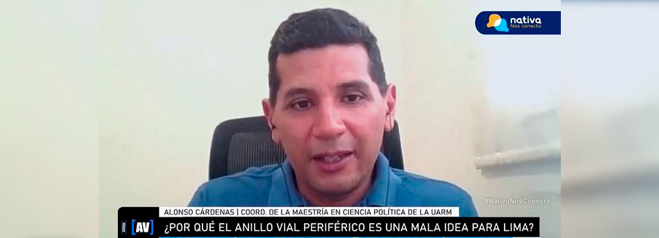Alonso Cárdenas, coordinador de la Maestría en Ciencia Política con mención en gerencia pública de la Universidad Antonio Ruiz de Montoya (UARM), participó en una entrevista con Raúl Tola vía Nativa TV, acerca del Anillo Vial Periférico (AVP), una megaobra declarada como de interés el 2023 por Proinversión y el Ministerio de Transportes y Comunicaciones (MTC), pero que, a su juicio, terminará agravando el problema de tránsito en Lima.