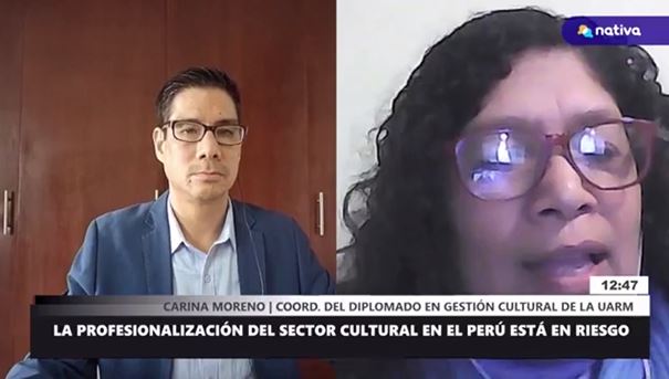 Carina Moreno, coordinadora del Diplomado en Gestión Cultural de la Universidad Antonio Ruiz de Montoya (UARM), participó en una entrevista vía Nativa TV sobre el riesgo de que las escuelas públicas de formación artística como la Escuela Nacional Superior Autónoma de Bellas Artes del Perú, la Escuela Nacional Superior de Arte Dramático, la Escuela Nacional Superior de Folklore José María Arguedas y la Escuela Nacional Superior de Ballet pierdan su condición de escuelas superiores. Afirmó que ello implicaría varios pasos atrás en la labor de profesionalización del sector cultural con un impacto negativo para la sociedad en general.