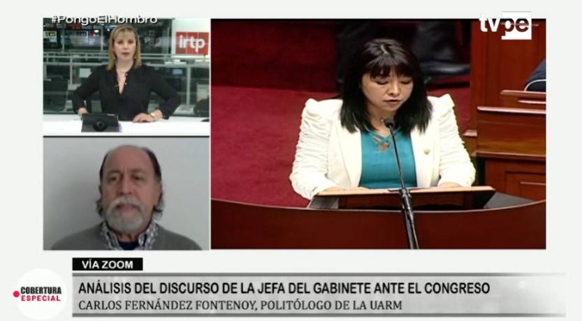 Luego de la exposición de la presidenta del Consejo de Ministros, Mirtha Vásquez, el politólogo Carlos Fernández Fontenoy, docente de la carrera de Ciencia Política de la Universidad Antonio Ruiz de Montoya (UARM), fue entrevistado en TV Perú sobre el discurso y el voto de confianza. “Me ha parecido un buen discurso por la inclusión de temas importantes. Resalto el llamado a un pacto de gobernabilidad, lo que significa una invocación a que todos los partidos se pongan de acuerdo, ya que ninguno tiene mayoría y el presidente no puede gobernar solo. Ese es el mensaje principal”, expresó.