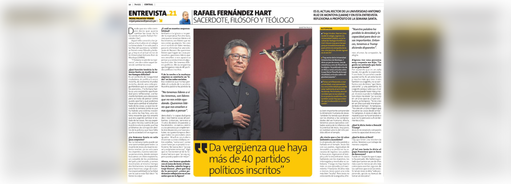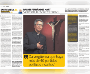 El P. Rafael Fernández Hart SJ, rector de la Universidad Antonio Ruiz de Montoya (UARM), fue entrevistado por el diario Perú 21, donde compartió sus reflexiones en torno la incertidumbre social y política en el marco de la Semana Santa. “Lo que nos recuerda la Semana Santa es que ha habido una víctima inocente, como las hay hoy, una víctima inocente que nos enseñó que era urgente cambiar el estado de las cosas”, sostuvo.