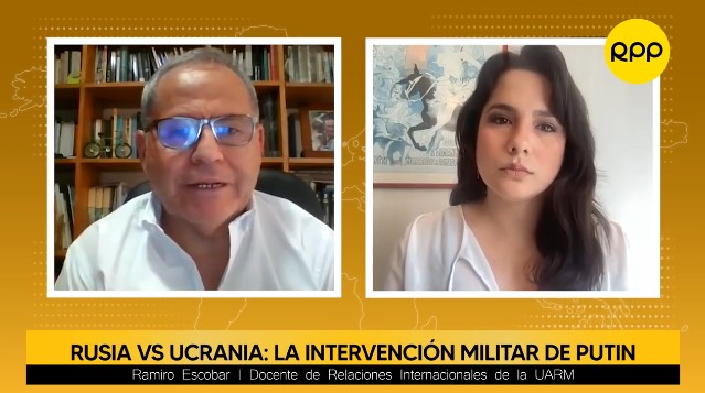 Ramiro Escobar, docente de la carrera de Ciencia Política de la Universidad Antonio Ruiz de Montoya (UARM), participó en una entrevista para RPP Live acerca de la crisis en Ucrania por la invasión militar rusa. Explicó que, a las fuerzas armadas de Rusia, que son una de las más potentes del mundo, no les tomará mucho tiempo tomar la capital de Ucrania, Kiev. “Sin duda las acciones de Rusia en Ucrania constituyen una invasión, ya que no solo efectuaron acciones militares en la zona de conflicto en Donbás. Ahora estamos entrando en una situación en la que se van a querer imponer decisiones por la fuerza y bajo presión política”, expresó.