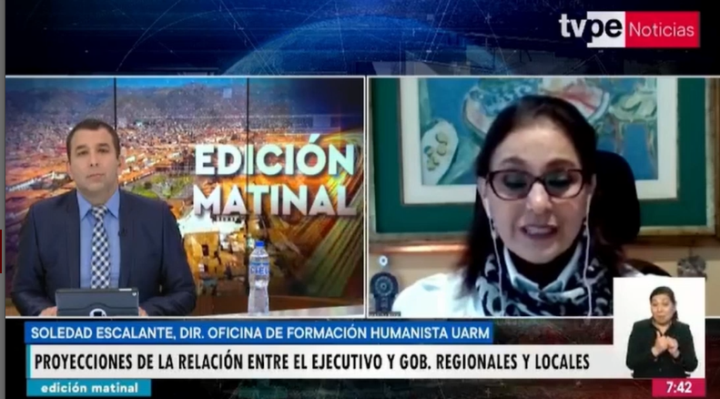 Soledad Escalante, directora de la Oficina de Formación Humanista de la Universidad Antonio Ruiz de Montoya (UARM), participó en una entrevista en TV Perú acerca de la relación que debe existir entre el Poder Ejecutivo y los gobiernos locales y regionales. Al respecto, indicó que el diálogo entre los diferentes niveles de gobierno del Estado es muy importante porque permite que se realicen intervenciones coordinadas en beneficio de poblaciones con mayores necesidades.