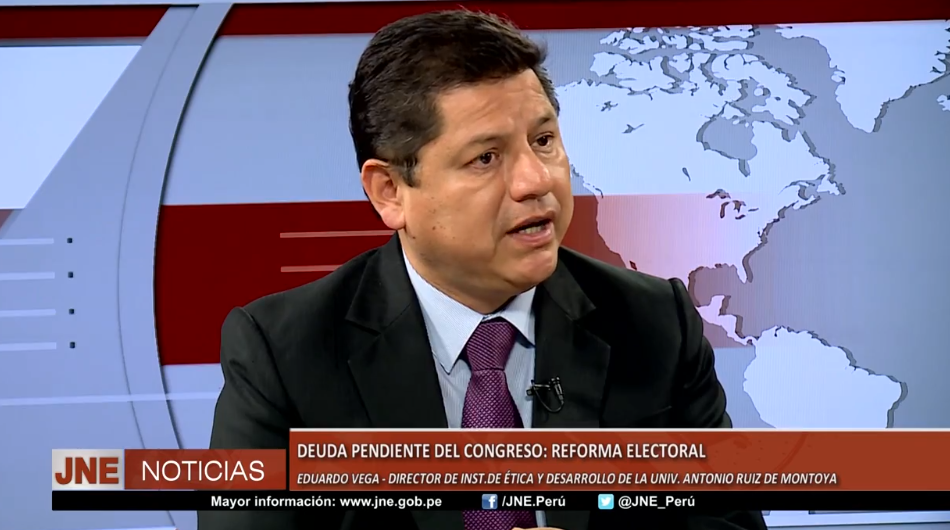 Eduardo Vega Luna, director del Instituto de Ética y Desarrollo (IED) de la Universidad Antonio Ruiz de Montoya, a través del canal del JNE, invocó al Congreso concretar antes de fin de año la reforma electoral para afrontar en mejores condiciones el proceso electoral del 2018. Espera que la nueva Mesa Directiva del Congreso cumpla con priorizar el tema en la próxima legislatura, así como los relacionados con la lucha contra la corrupción y la reforma de la contraloría.
