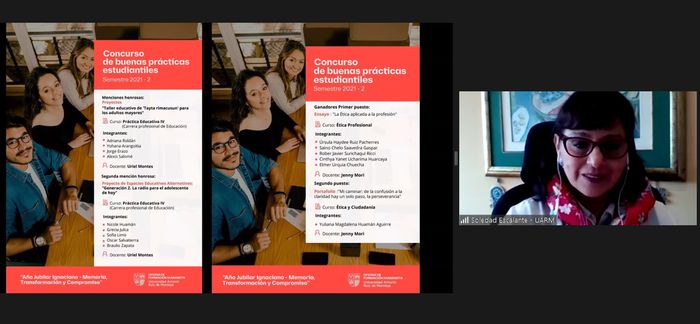 La Oficina de Formación Humanista de la Universidad Antonio Ruiz de Montoya (UARM) presentó los ganadores de la primera edición del Concurso Buenas Prácticas- Año Ignaciano 2021 2 Memoria, Transformación y Compromiso. En la primera etapa del concurso cada docente presentó al Comité Organizador una iniciativa académica por cada curso desarrollado durante el semestre. En la segunda etapa, el jurado evaluador calificó las propuestas y eligió las tres mejores para su posterior reconocimiento. Se valoró la pertinencia, la universalidad, la incidencia y la innovación.