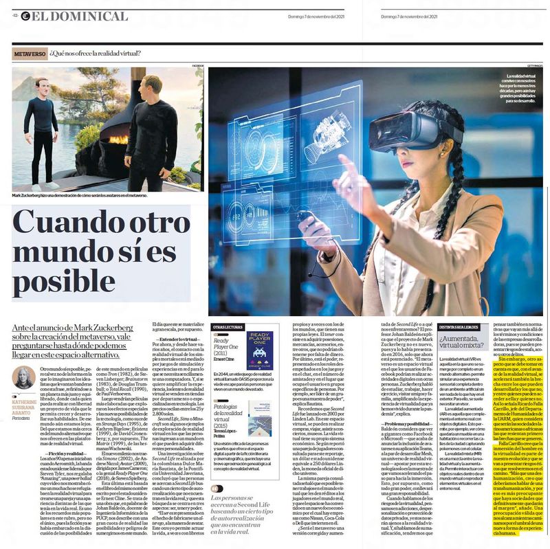Ante el anuncio de Mark Zuckerberg sobre la creación del metaverso para usuarios de Facebook, El Comercio elaboró un informe sobre hasta dónde podemos llegar en el espacio alternativo que nos propone la realidad virtual, en el cual participó Ricardo Falla Carrillo, jefe del Departamento de Humanidades de la Universidad Antonio Ruiz de Montoya (UARM).