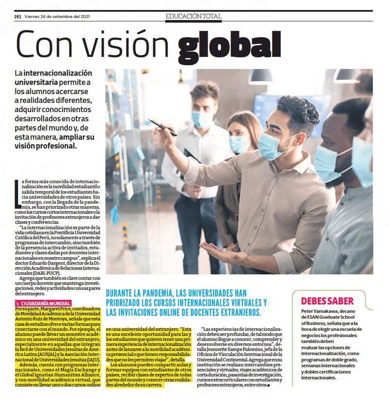 Margaret Price, coordinadora de Movilidad Académica de la Universidad Antonio Ruiz de Montoya (UARM), participó en un informe de El Comercio acerca de la importancia de las experiencias de internacionalización durante la formación de pregrado. La especialista destacó que, en lo académico, es una oportunidad para demostrar competencias en un nuevo ambiente y ampliar conocimientos a través de nuevas perspectivas y metodologías de enseñanza. En lo personal, nos reta a reflexionar, conocernos mejor y comunicar a través del diálogo intercultural, y es una oportunidad para aumentar autoconfianza, empatía, independencia y responsabilidad.