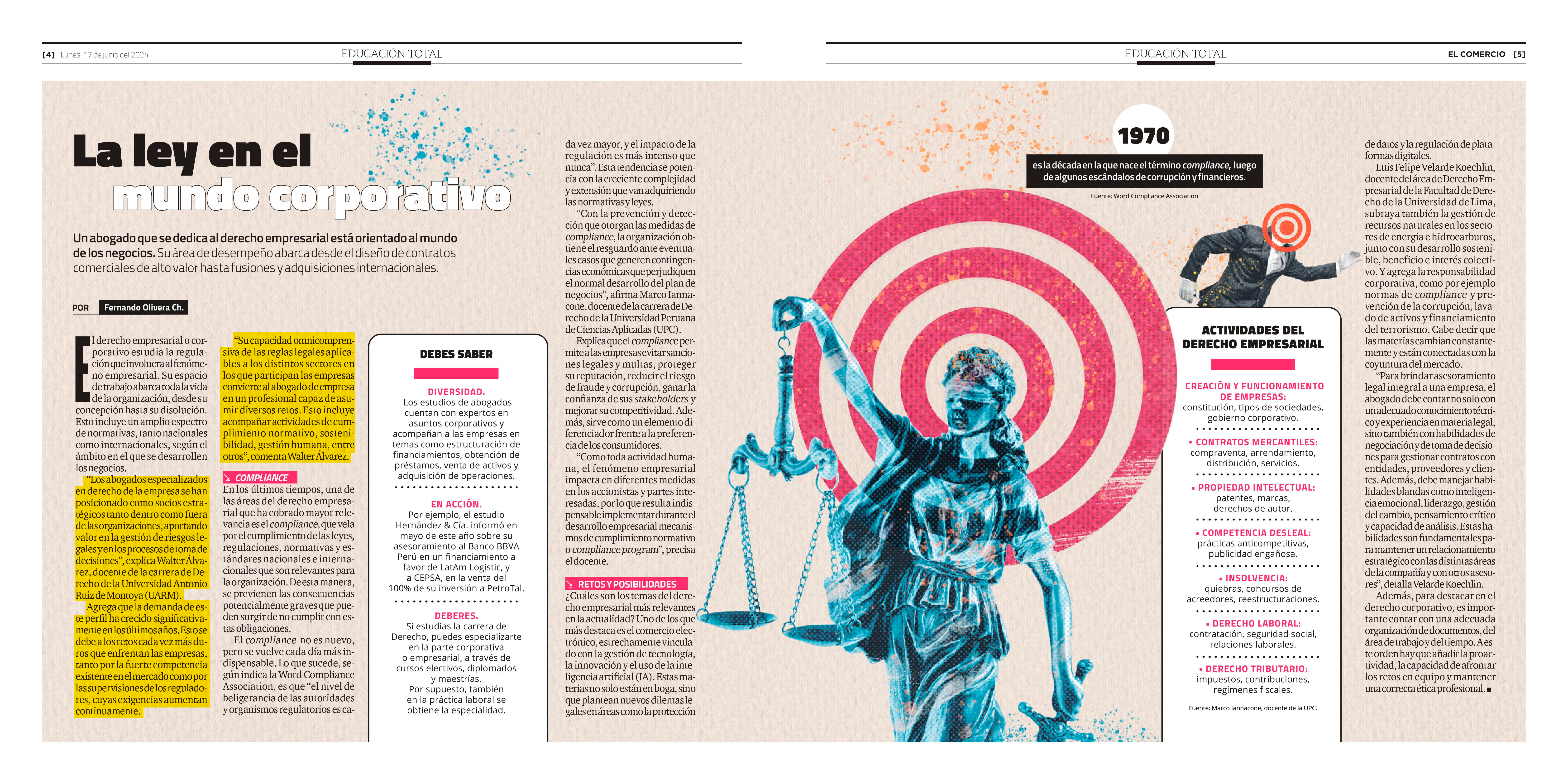 Walter Alvarez, docente de la carrera de Derecho de la Universidad Antonio Ruiz de Montoya (UARM), participó en un informe de El Comercio sobre cuáles son los principales aportes de los profesionales en el campo del Derecho empresarial en el Perú y cómo ha evolucionado su demanda. Comentó que, sin duda, los abogados especializados en derecho de la empresa se han posicionado como socios estratégicos tanto dentro como fuera de las organizaciones, ello debido a que aportan valor en la gestión de riesgos legales y en los procesos de toma de decisiones para la mayor rentabilidad de las empresas.