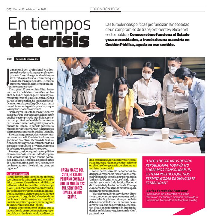 El Dr. Carlos Fernández Fontenoy, coordinador de la Maestría en Ciencia Política con mención en Gerencia Pública de la Universidad Antonio Ruiz de Montoya (UARM), participó en un informe de El Comercio acerca de la relevancia de los posgrados vinculados a profundizar un compromiso de trabajo eficiente y ético en el sector público.