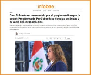 Alonso Cárdenas, docente de la carrera de Ciencia Política de la Universidad Antonio Ruiz de Montoya (UARM), participó en un informe de Infobae.pe sobre las consecuencias legales y políticas de las cirugías estéticas de la presidenta Dina Boluarte, tras la declaración pública del médico cirujano Mario Cabani. Es importante recordar que durante el periodo de recuperación se publicaron normas que llevaban la firma de la mandataria peruana, por lo cual, la Fiscalía de la Nación abrió una línea de investigación, sumado al posible abandono del cargo.