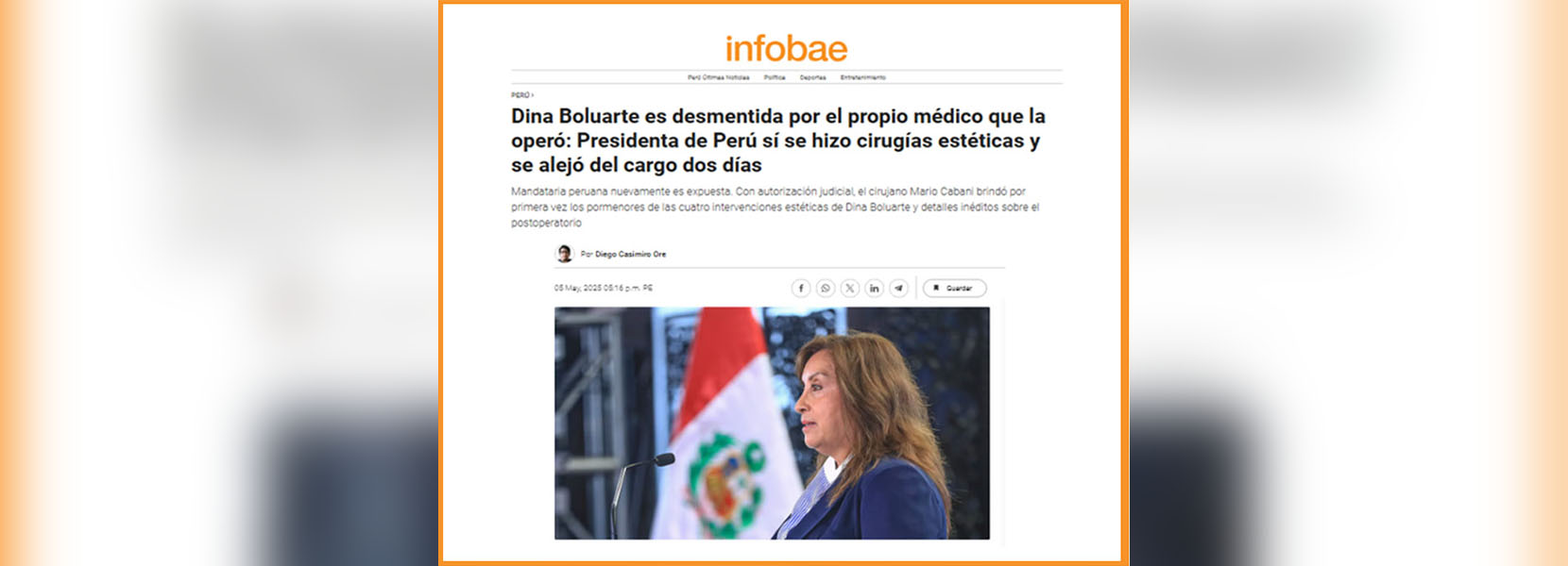 Alonso Cárdenas, docente de la carrera de Ciencia Política de la Universidad Antonio Ruiz de Montoya (UARM), participó en un informe de Infobae.pe sobre las consecuencias legales y políticas de las cirugías estéticas de la presidenta Dina Boluarte, tras la declaración pública del médico cirujano Mario Cabani. Es importante recordar que durante el periodo de recuperación se publicaron normas que llevaban la firma de la mandataria peruana, por lo cual, la Fiscalía de la Nación abrió una línea de investigación, sumado al posible abandono del cargo.