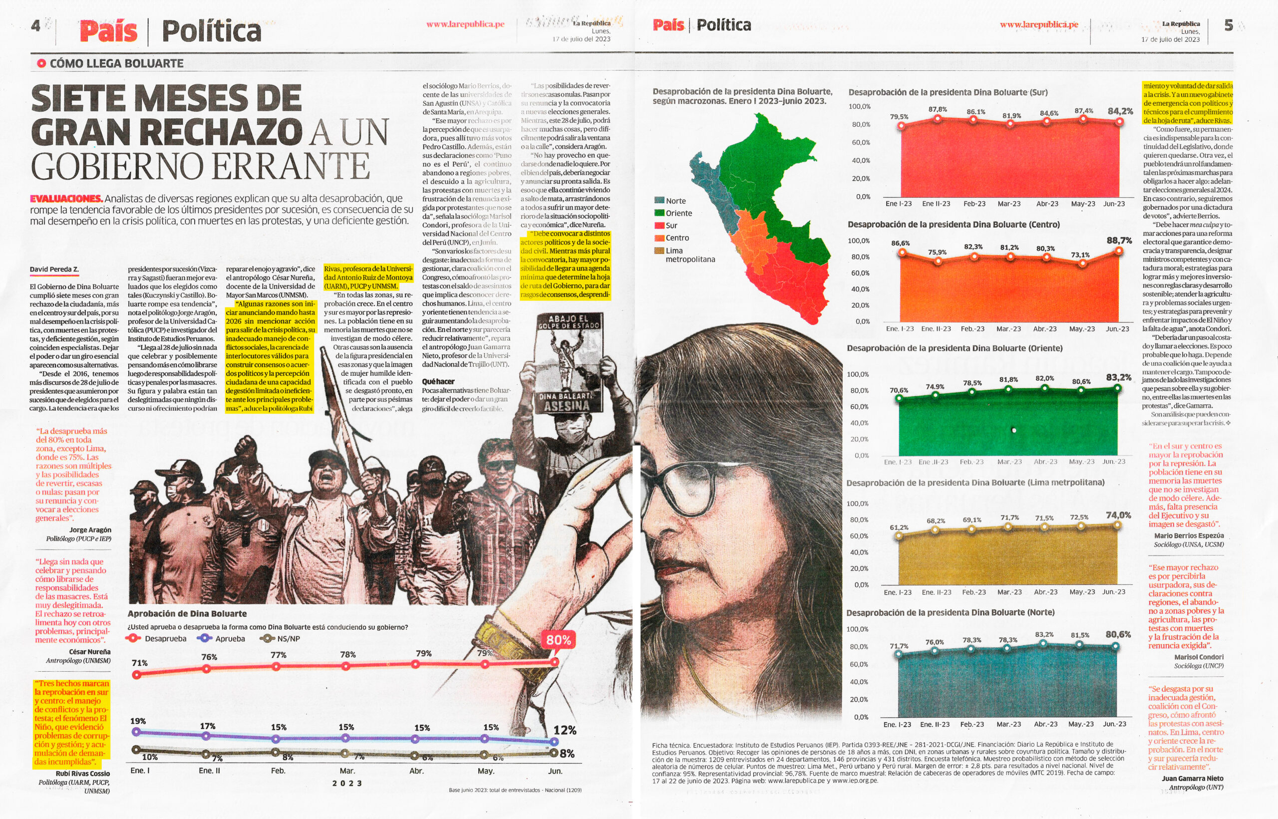 Rubí Rivas Cossio, coordinadora de la Maestría en Ciencia Política con mención en Gerencia Pública de la Universidad Antonio Ruiz de Montoya (UARM), participó en un informe de La República acerca de la baja aprobación de la presidenta Dina Boluarte al cumplir siete meses de gobierno. La politóloga considera que una de las razones del rechazo es haber iniciado su gestión anunciando mando hasta el 2026 sin mencionar acciones para salir de la crisis política, así como su inadecuado manejo de conflictos sociales, la carencia de interlocutores válidos para construir consensos o acuerdos políticos y la percepción ciudadana de una capacidad de gestión limitada o ineficiente ante los principales problemas.