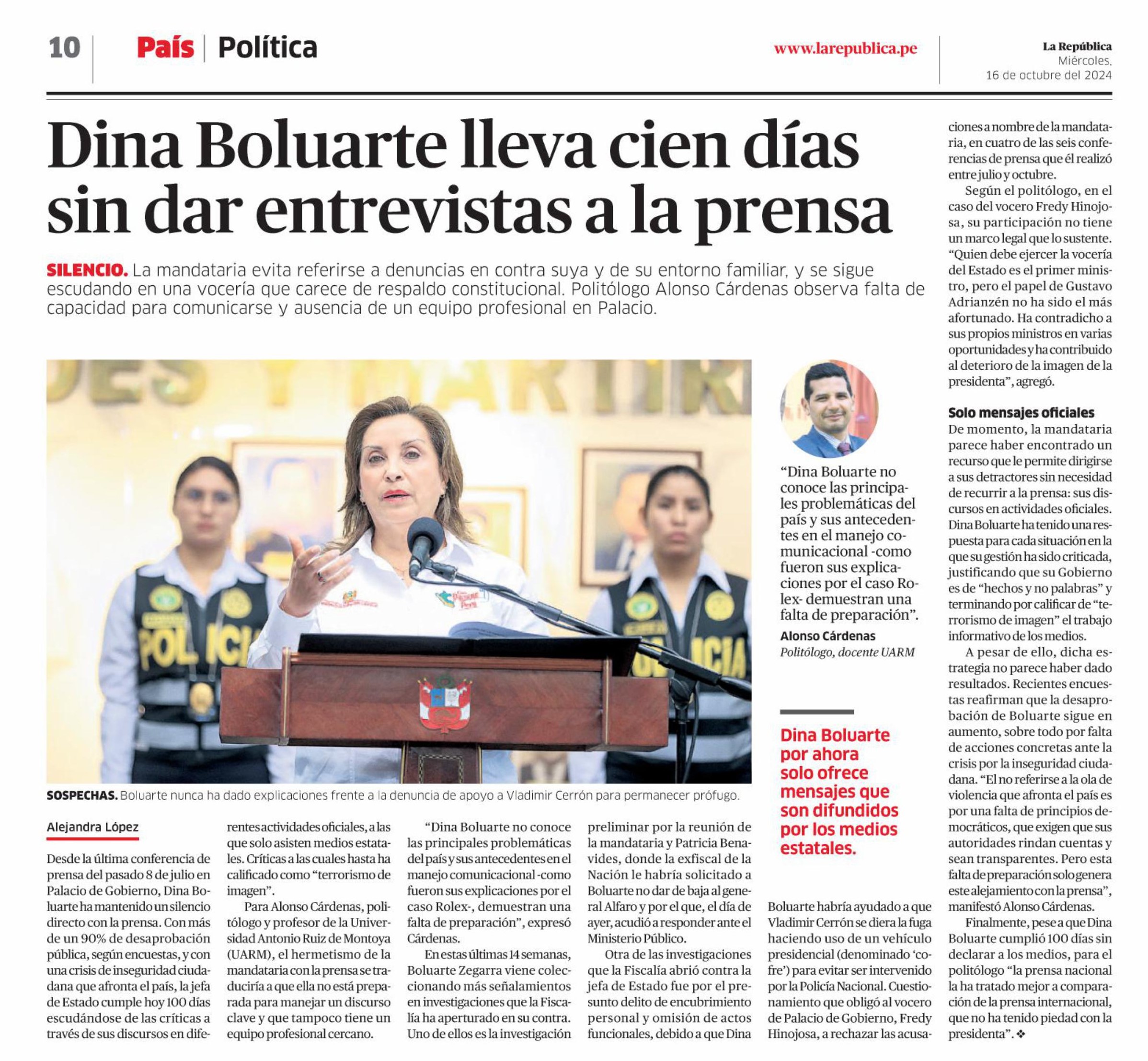 En medio de la inseguridad ciudadana y la desaprobación de la población, la presidenta Dina Boluarte no ha brindado declaraciones a la prensa. Al respecto, Alonso Cárdenas, coordinador de la Maestría en Ciencia Política con mención en gerencia pública de la Universidad Antonio Ruiz de Montoya (UARM), compartió su análisis con La República.