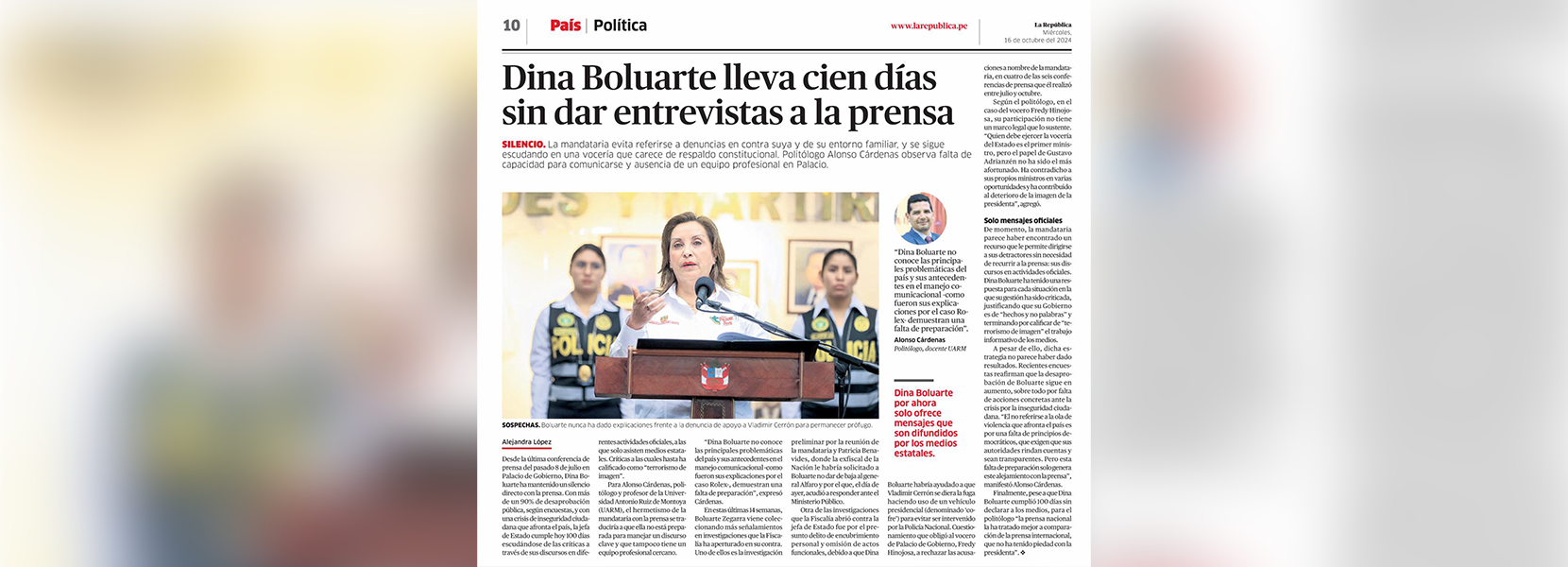 Para el politólogo, el hermetismo de la mandataria con la prensa se traduciría a que ella no está preparada para manejar un discurso clave y que se denota la ausencia profesional del equipo que la rodea. “Dina Boluarte no conoce las principales problemáticas del país y sus antecedentes en el manejo comunicacional —como fueron sus explicaciones por el caso Rolex—, demuestran una falta de preparación”, expresó Cárdenas.