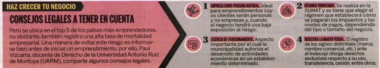 Paul Vizcarra, docente de la carrera de Derecho de la Universidad Antonio Ruiz de Montoya (UARM), participó en un informe en la sección Emprendedor de Diario Ojo, en el cual aportó algunos consejos legales para que los emprendedores hagan crecer su negocio.