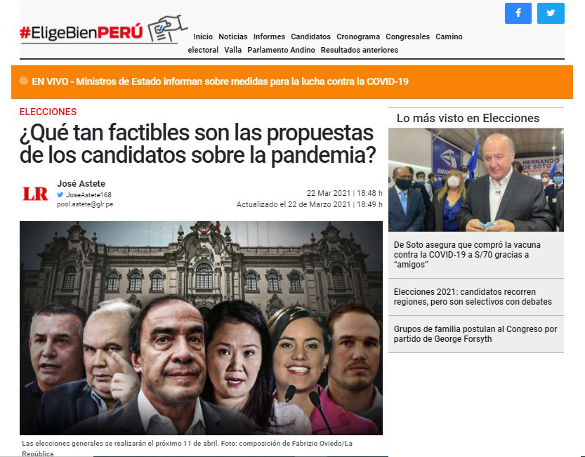 Alonso Cárdenas, docente de la Escuela de Ciencia Política (CIPO) de la Universidad Antonio Ruiz de Montoya, participó en un informe de La República sobre la viabilidad de las propuestas de los aspirantes al sillón presidencial respecto a la pandemia. Para el politólogo, la COVID-19 se puede controlar en mejor medida de lo que se hecho nuestro país. Sostuvo que incluso países que en el papel son menos desarrollados, como Bolivia, se han desempeñado mejor.