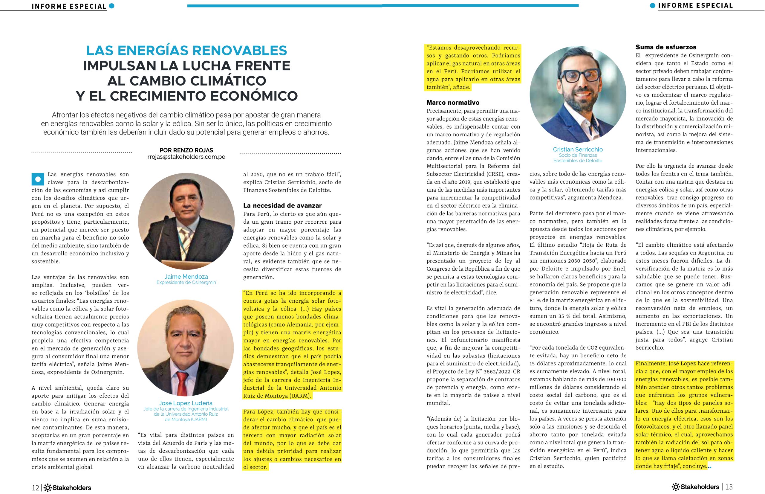 José Manuel Lopez Ludeña, jefe de la carrera de Ingeniería Industrial de la Universidad Antonio Ruiz de Montoya (UARM), participó en un informa de la Revista Stakeholders sobre cómo las energías renovables impulsan la lucha frente al cambio climático y el crecimiento económico. “En Perú se ha ido incorporando, a cuenta gotas, la energía solar fotovoltaica y la eólica. Hay países que poseen menos bondades climatológicas (como Alemania, por ejemplo) y tienen una matriz energética mayor en energías renovables. Por las bondades geográficas, los estudios demuestran que el país podría abastecerse tranquilamente de energías renovables”, expresó.