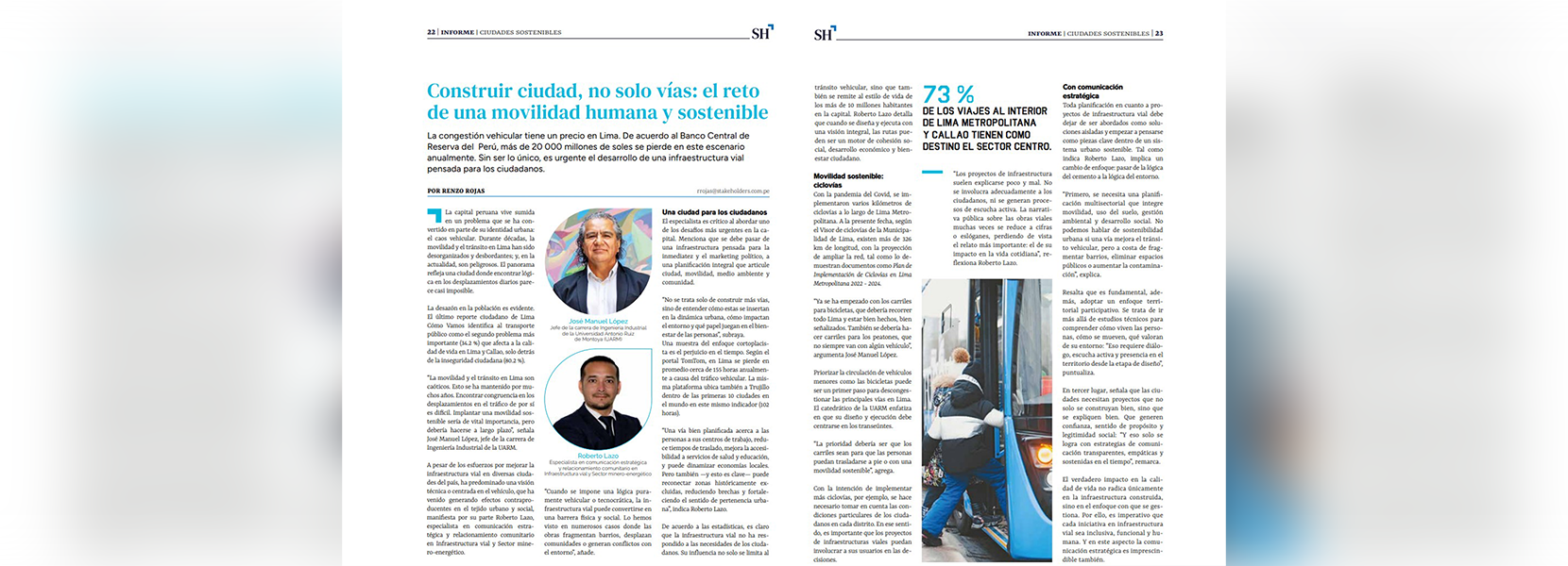 José Manuel López Ludeña, jefe de la carrera de Ingeniería Industrial de la Universidad Antonio Ruiz de Montoya (UARM), participó en un informe de la Revista Stakeholders sobre movilidad sostenible en el Perú. En su intervención, sostuvo que Lima necesita contar con un plan a largo plazo para mejorar su tránsito vehicular.