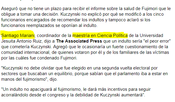 El presidente Pedro Pablo Kuczynski expresó en RPP, el 6 de octubre, que no quiere ver morir en prisión al exmandatario Alberto Fujimori. Estas declaraciones las brindó luego de que se cambió a los miembros de la Comisión de Gracias Presidenciales, que invita a especialistas médicos para que evalúen las condiciones de salud de un aspirante a ser excarcelado por razones humanitarias. En este contexto, en el que el indulto parecería estar muy cerca, Santiago Mariani, coordinador de la Maestría en Ciencia Política de la Universidad Antonio Ruiz de Montoya, fue entrevistado por The Associated Press.