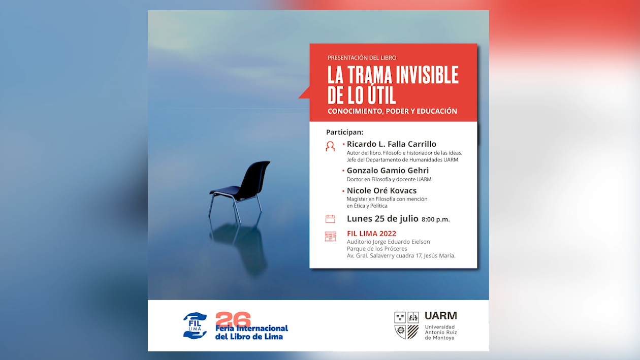 El 25 de julio la Universidad Antonio Ruiz de Montoya (UARM) presentó el libro “La trama invisible de lo útil. Reflexiones sobre conocimiento, poder y educación”, del filósofo Ricardo Falla, jefe del Departamento de Humanidades. El evento se realizó en la Feria Internacional del Libro de Lima y contó con la participación de Gonzalo Gamio (docente UARM) y Nicole Oré (Mg. En Filosofía).