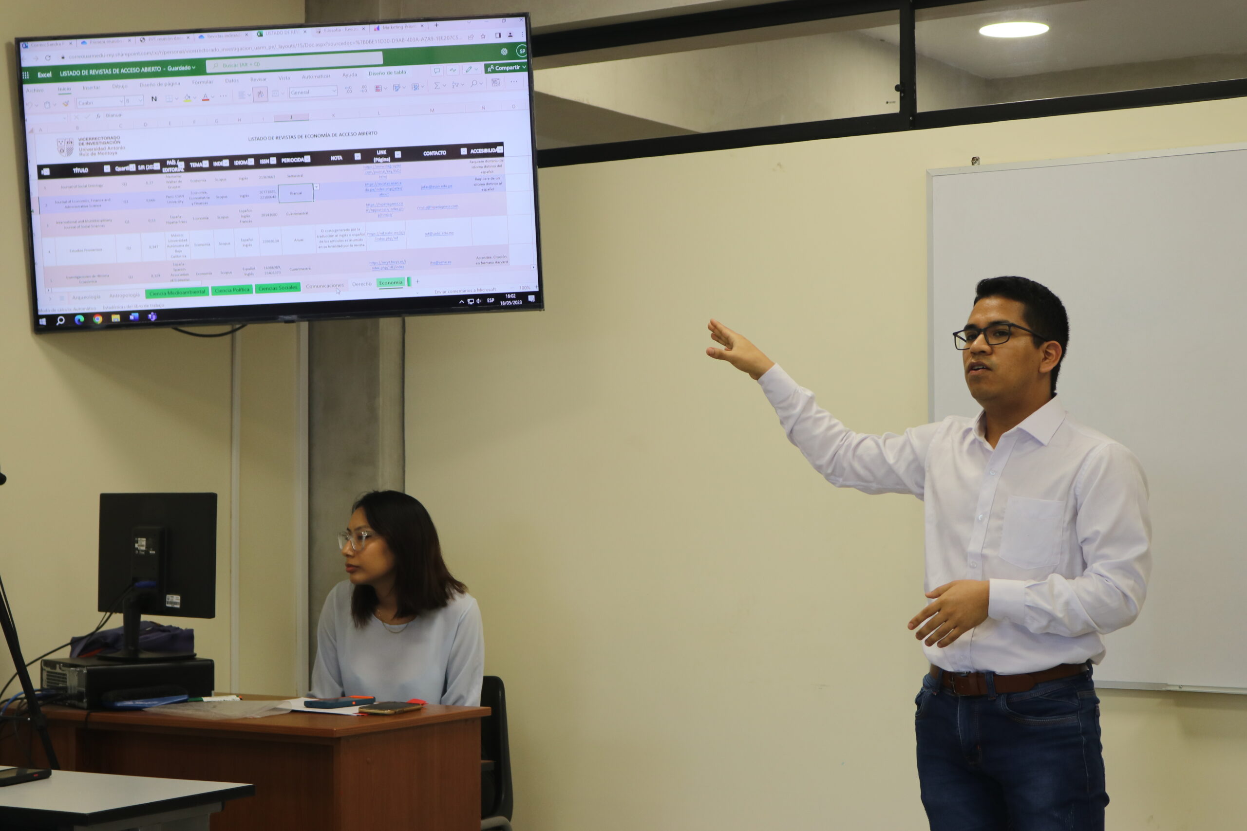 Gonzalo Córdova, responsable de Servicios y Productos de Información de Biblioteca, expuso los servicios de apoyo a la investigación que ofrecen, los cuales incluyen una colaboración con las bibliotecas de las universidades AUSJAL. Ello hace posible que los docentes de la UARM accedan a libros y materiales bibliográficos actualizados para sus investigaciones.