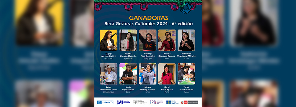 Lima, 10 de junio de 2024.- UNESCO Perú, el Museo de Arte de Lima (MALI), la Escuela de Posgrado de la Universidad Antonio Ruiz de Montoya (UARM) y la Escuela de Posgrado de la Universidad Peruana de Ciencias Aplicadas (UPC) con el apoyo del Ministerio de Cultura, dan a conocer a las ganadoras de la sexta edición de la Beca "Gestoras Culturales".