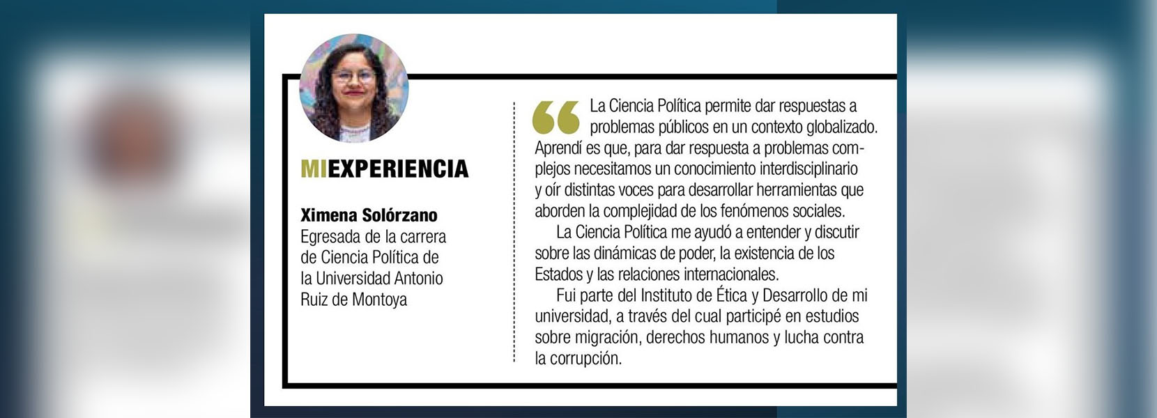 Fui parte del Instituto de Ética y Desarrollo de mi universidad, a través del cual participé en estudios sobre migración, derechos humanos y lucha contra la corrupción. He trabajado en el Ministerio de Justicia y Derechos Humanos, haciendo políticas públicas en Derechos Humanos, y en la Superintendencia Nacional de Migraciones, donde desarrollé conocimientos en temas de movilidad humana. Actualmente, soy consultora independiente y docente de un programa de capacitación a jóvenes universitarios para promover la investigación en temas migratorios. La Ciencia Política es una carrera para personas que se sienten interpeladas por la desigualdad social y que tienen la necesidad de luchar contra la injusticia social.