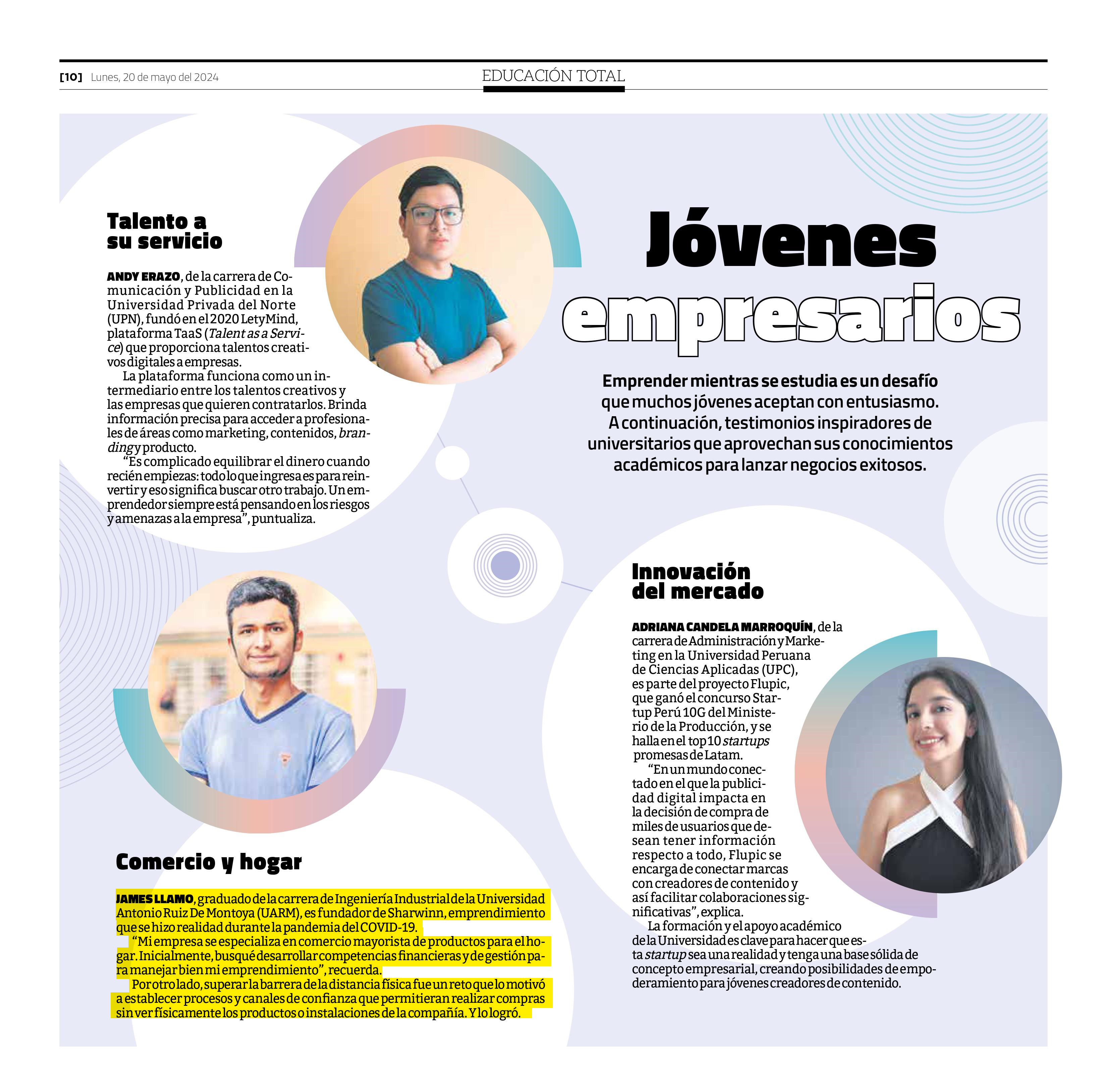 James Llamo, ingeniero industrial de la Universidad Antonio Ruiz de Montoya (UARM), brindó un testimonio a El Comercio sobre su emprendimiento Sharwinn, el cual hizo realidad durante la pandemia del COVID-19. “Mi empresa se especializa en comercio mayorista de productos para el hogar. Para manejar bien mi emprendimiento busqué desarrollar competencias financieras y de gestión, y aplicar en todo momento lo aprendido en las aulas”, expresó. Por otro lado, comentó que superar la barrera de la distancia física fue un reto que lo motivó a establecer procesos y canales de confianza que permitieran realizar compras sin ver físicamente los productos o instalaciones de la compañía. Y lo logró.