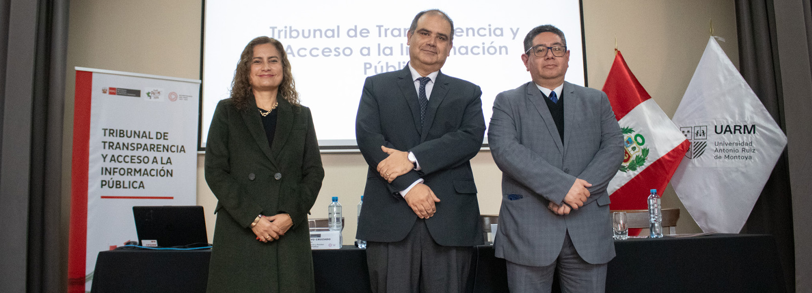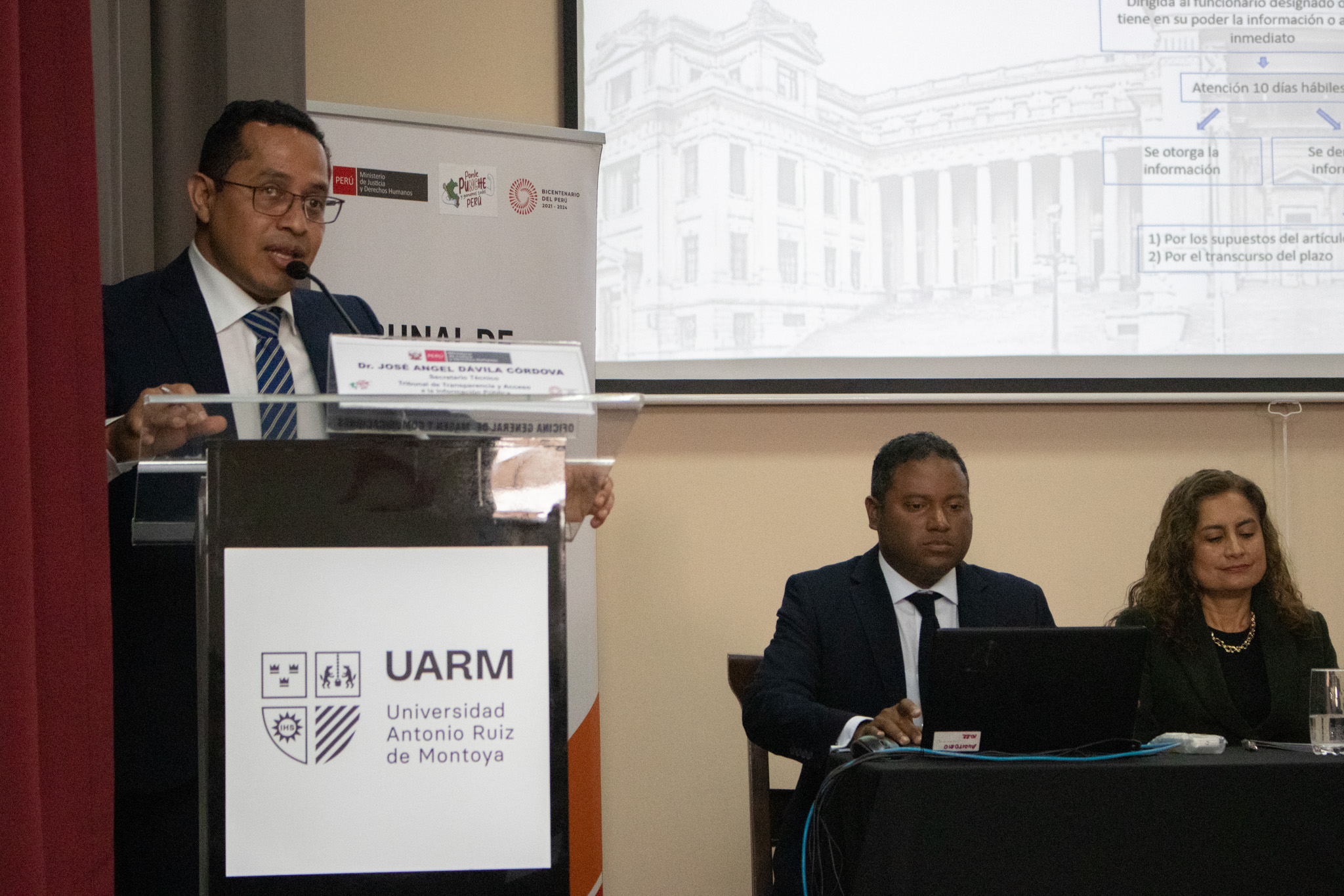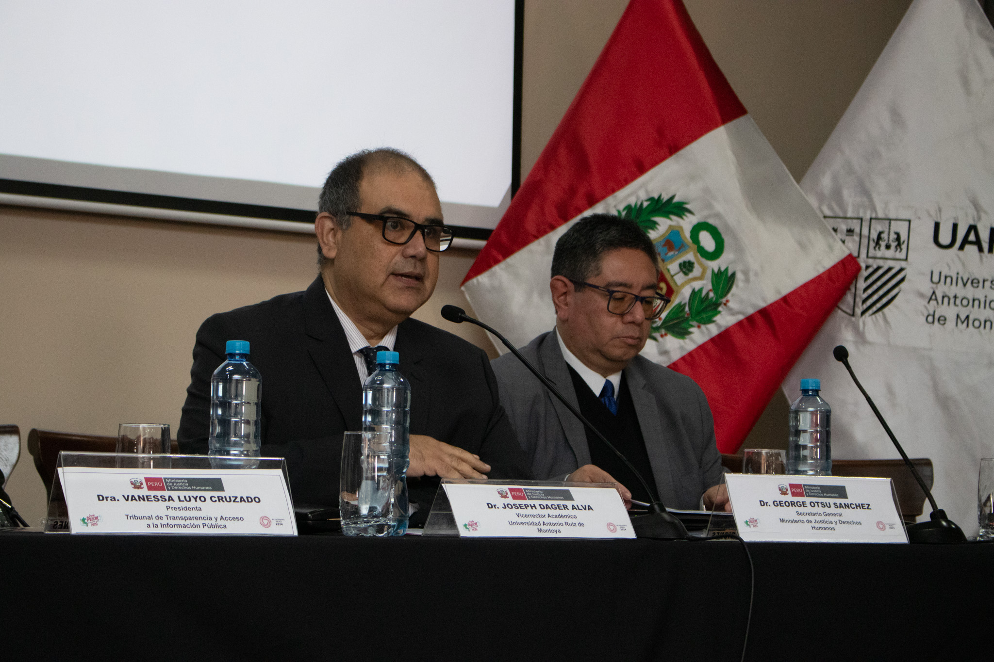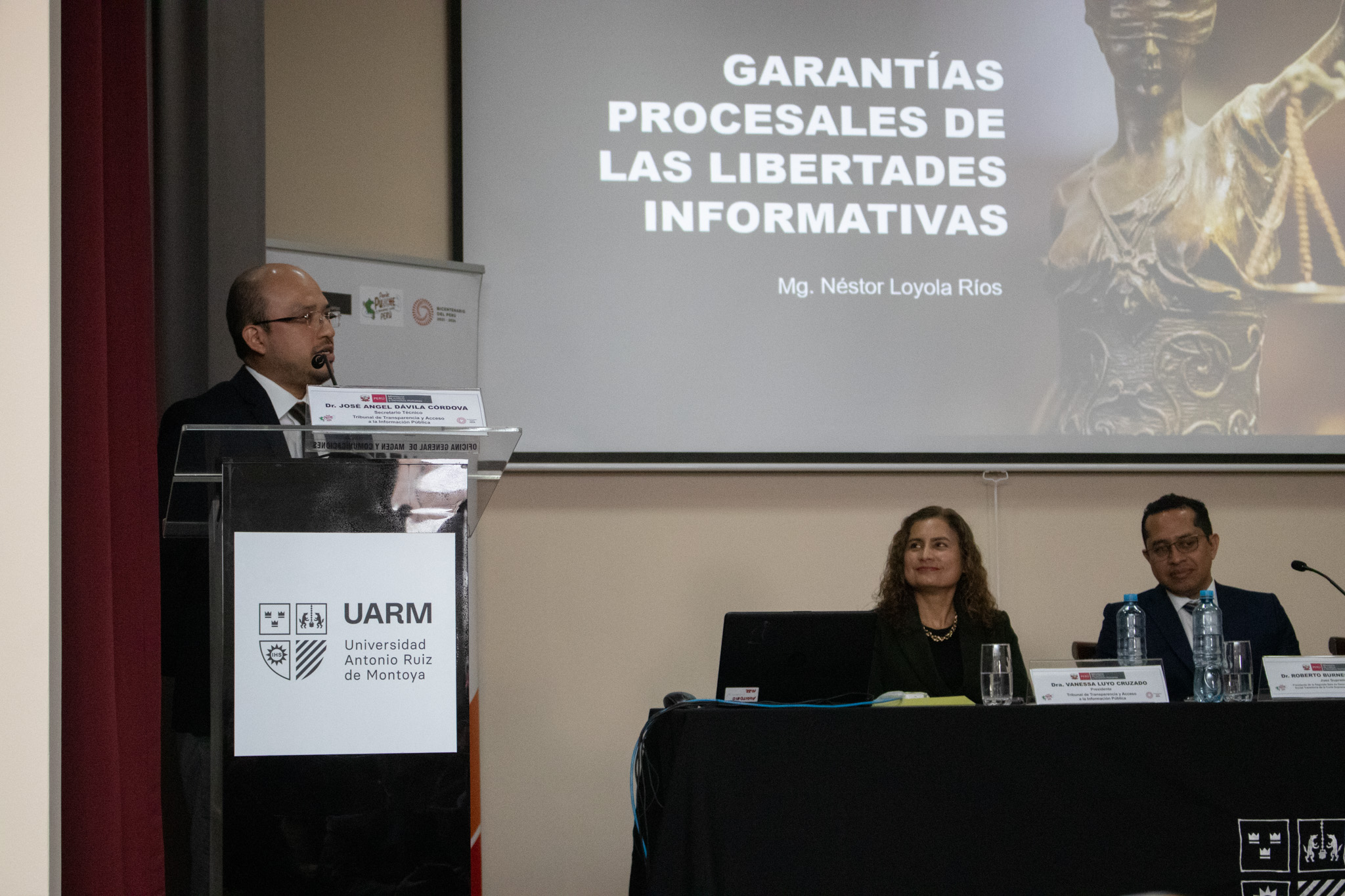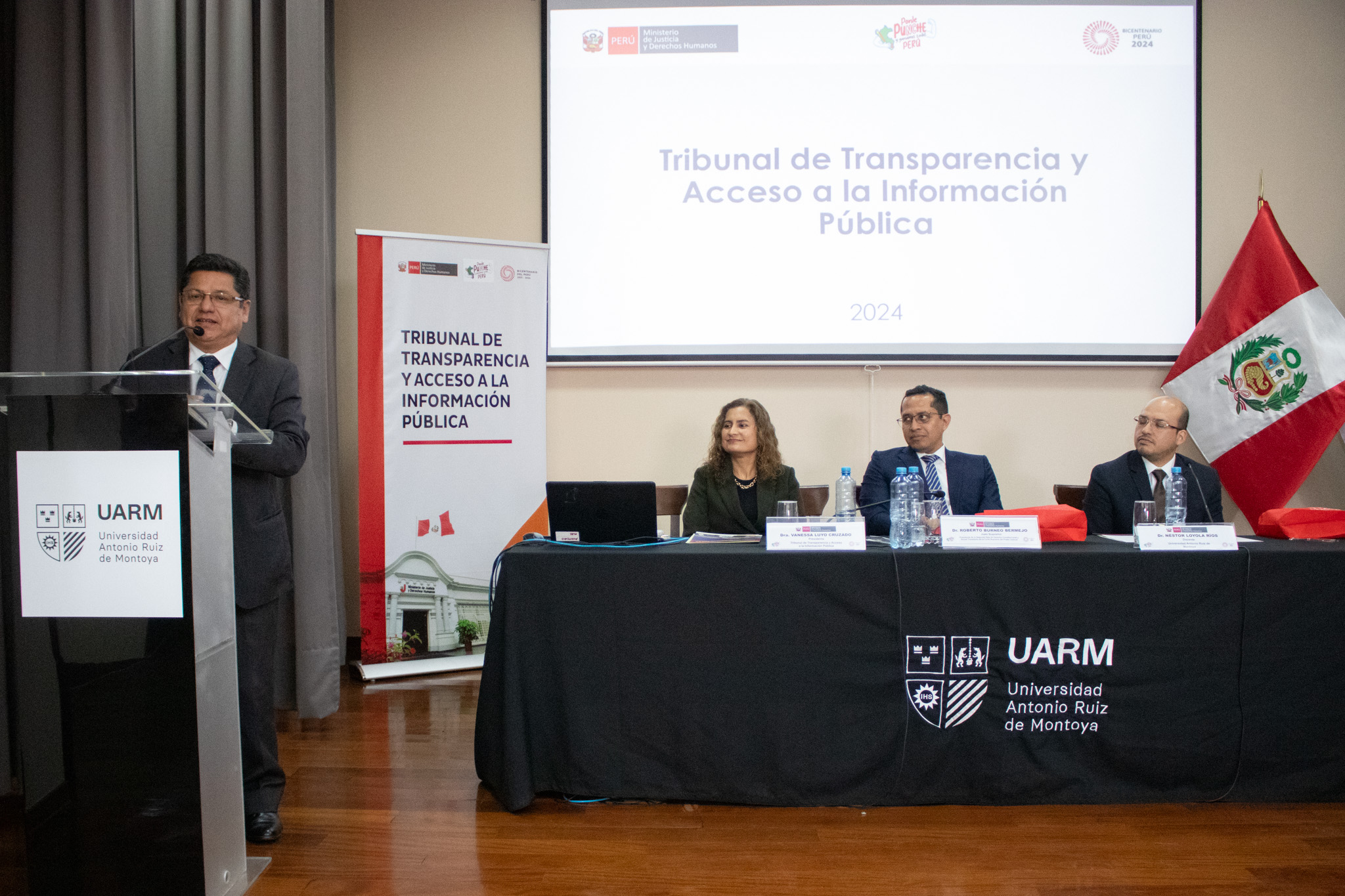 El evento contó con la participación de George Otsu, secretario general del MINJUSDH; Vanessa Luyo, presidenta del Tribunal de Transparencia y Acceso a la Información Pública del MINJUSDH; Roberto Burneo, juez supremo titular del Poder Judicial del Perú; Néstor Loyola, docente de la Carrera de Derecho UARM; y Eduardo Vega Luna, decano de la Facultad de Ciencias Sociales.