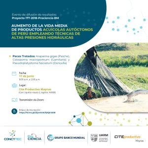 Con la finalidad de aumentar la competitividad de los productos acuícolas mediante la optimización de procesos, nuevas tecnologías y mejoras de producción, Prociencia y la Universidad Antonio Ruiz de Montoya (UARM) desarrollaron en conjunto el proyecto “Aumento de la vida de productos acuícolas autóctonos de Perú empleando técnicas de altas presiones hidráulicas”, el cual se viene trabajando desde hace más de 3 años, gracias al financiamiento del Banco Mundial.