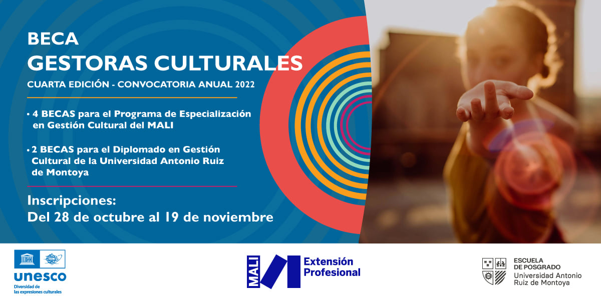 UNESCO en Perú, el Museo de Arte de Lima (MALI) y la Universidad Antonio Ruiz de Montoya (UARM) se unen para lanzar la Beca "Gestoras Culturales", convocatoria 2022, la cuarta edición de la beca dirigida a mujeres peruanas que ejercen la gestión cultural en organizaciones culturales o de manera independiente.