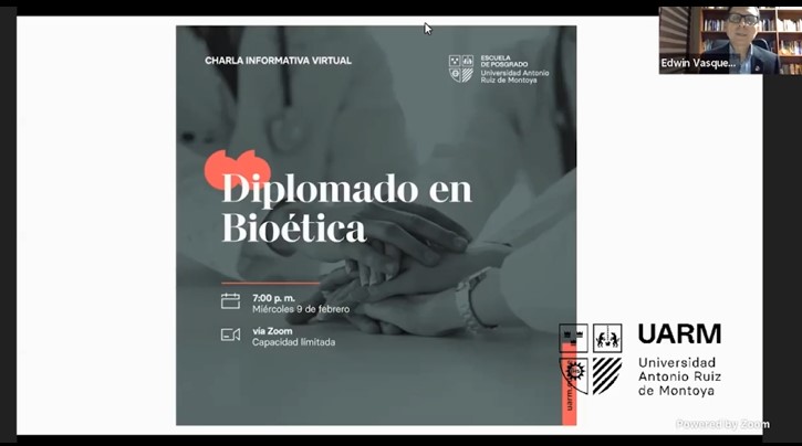La Escuela de Posgrado de la Universidad Antonio Ruiz de Montoya (UARM) presentó la Charla informativa del Diplomado en Bioética, a cargo del Dr. Edwin Vásquez Ghersi, SJ, y la Dra. Virginia Garaycochea.