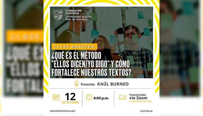 El área de Formación Continua de la Universidad Antonio Ruiz de Montoya realizó la clase maestra ¿Qué es el método "Ellos dicen/yo digo" y cómo fortalece nuestros textos?, el 12 de octubre. La ponencia estuvo a cargo de Raúl Burneo.
