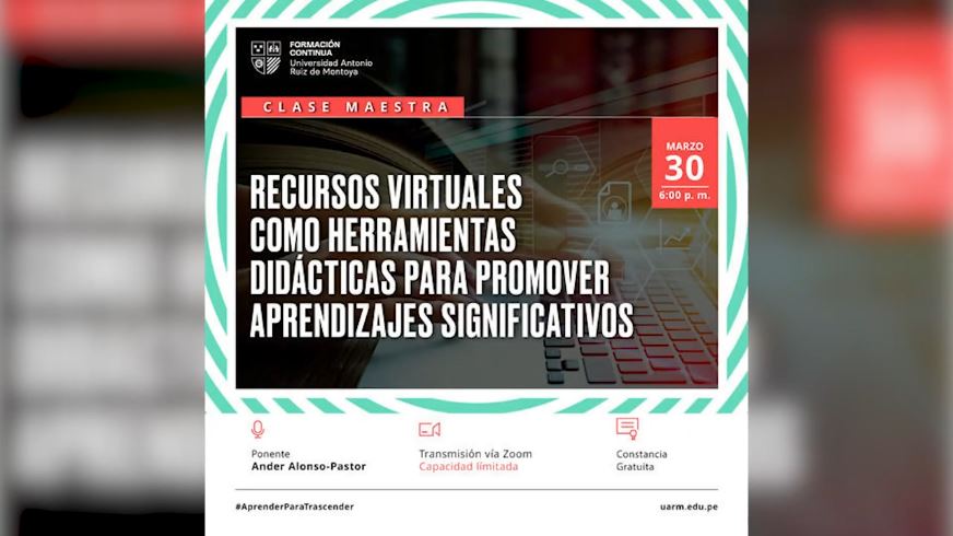 El área de Formación Continua de la Universidad Antonio Ruiz de Montoya presentó la Clase maestra: Recursos virtuales como herramientas didácticas para promover aprendizajes significativos, el 30 de marzo de 2022. La ponencia estuvo a cargo de Ander Alonso-Pastor. Para mayor información del curso de extensión "Diseño de recursos digitales educativos" aquí.