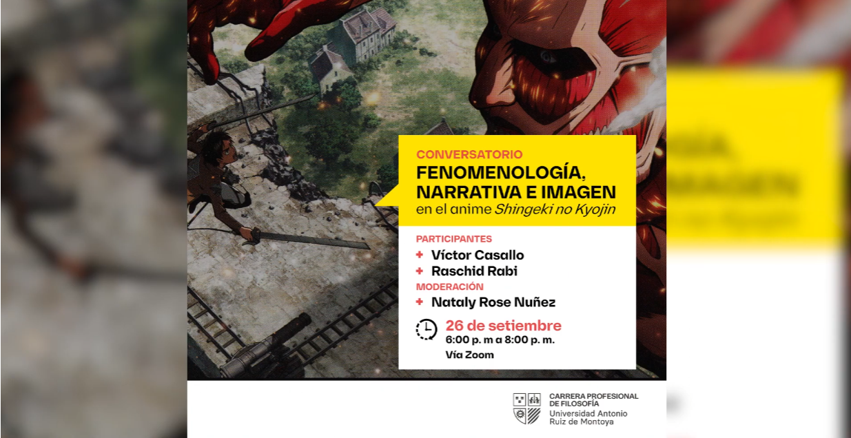 La carrera profesional de Filosofía de la Universidad Antonio Ruiz de Montoya realizó Conversatorio: Fenomenología, narrativa e imagen en el anime Shingeki no Kyojin, el 26 de setiembre. El evento contó con la participación de Víctor Casallo y Raschid Rabi, docentes de la UARM; así como la moderación de Nataly Rose Nuñez.